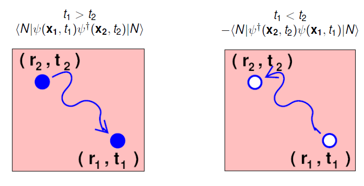 برای $ t>t' $ $( t'>t ) $ تابع گرین انتشار یک ذره (حفره) اضافه شده به سیستم $ N $ الکترونی را توصیف میکند. به عبارتی $ G $ دینامیک برانگیختگیهای $N\to N\pm1$ را توصیف میکند.